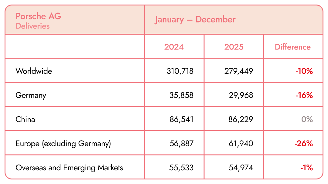 Według Porsche kluczowe były trzy czynniki: przerwy w dostępności wersji spalinowych 718 i Macana, osłabienie popytu na dobra luksusowe w Chinach oraz konsekwentne trzymanie się strategii „wartość ponad wolumen” (czyli kontrola podaży i miksu wersji). Dodatkowo spalinowe 718 są już wygaszane – produkcja zakończyła się w październiku 2025 r.