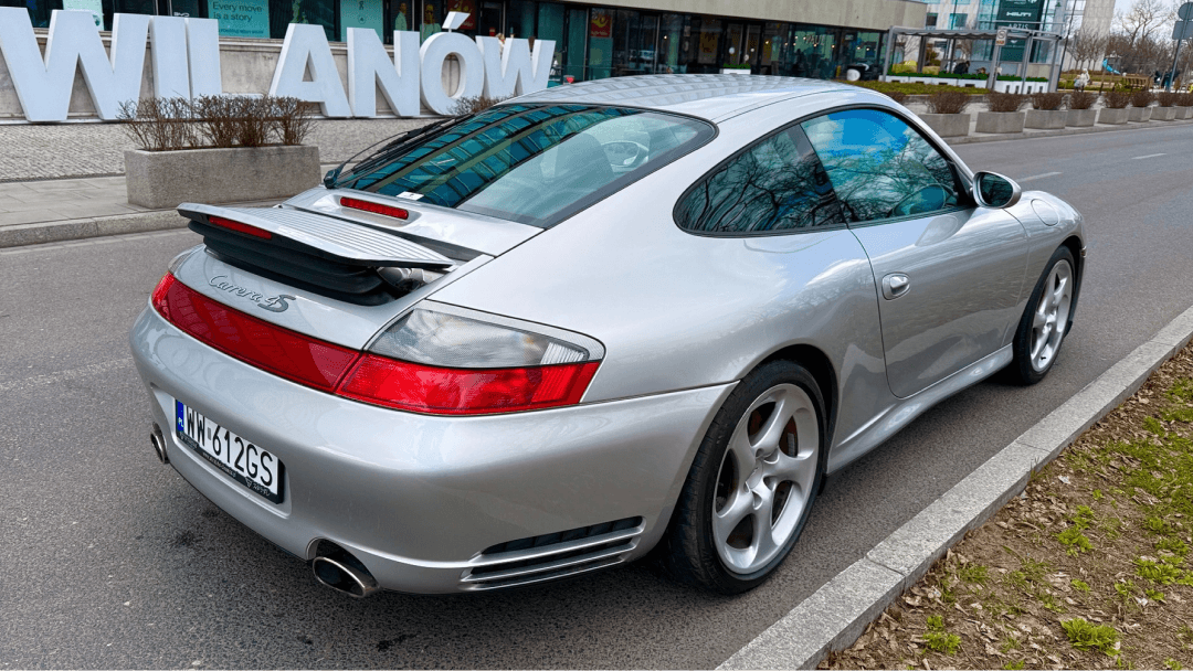 Porsche 911 (996.2) Carrera 4S z 2003 roku, sprowadzone z Japonii, z przebiegiem 61 000 km. Samochód napędzany jest 3,6-litrowym wolnossącym silnikiem bokser o mocy 320 KM, współpracującym z 6-biegową manualną skrzynią biegów. Egzemplarz w kolorze Arctic Silver Metallic z czarnym wnętrzem w pełnej skórze, podsufitką w alcantarze oraz srebrnymi wstawkami na desce rozdzielczej. Sprzedający informuje o jednym właścicielu i regularnym serwisowaniu w ASO Porsche przez 23 lata. Wśród wyposażenia znajdziemy m.in. fabryczny system audio BOSE z subwooferem, sportowe fotele, fabryczny short shifter, felgi 18" Turbo Twist oraz nowe opony. Zamontowane zostało również radio Pioneer z bezprzewodowym CarPlay/Android Auto oraz kamera cofania.