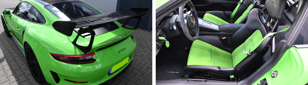 Porsche 911 (991.2) GT3 RS z 2019 roku, pochodzące z polskiego salonu, z przebiegiem 24 700 km. Samochód napędzany jest 4,0-litrowym, wolnossącym silnikiem o mocy 520 KM, współpracującym z 7-biegową skrzynią PDK. Kluczową informacją jest wymiana silnika na nowy, która miała miejsce przy przebiegu 12 000 km w serwisie ASO Porsche. Egzemplarz w kolorze Lizard Green wyposażony jest w pakiet Weissach, obejmujący m.in. dach, maskę i tylne skrzydło z karbonu oraz oryginalne felgi magnezowe 20"/21" z centralną śrubą. Wnętrze wykończone alcantarą i karbonem z fotelami kubełkowymi z karbonu. Nadwozie zabezpieczone folią ochronną PPF na całej powierzchni. Auto objęte gwarancją Porsche Approved.